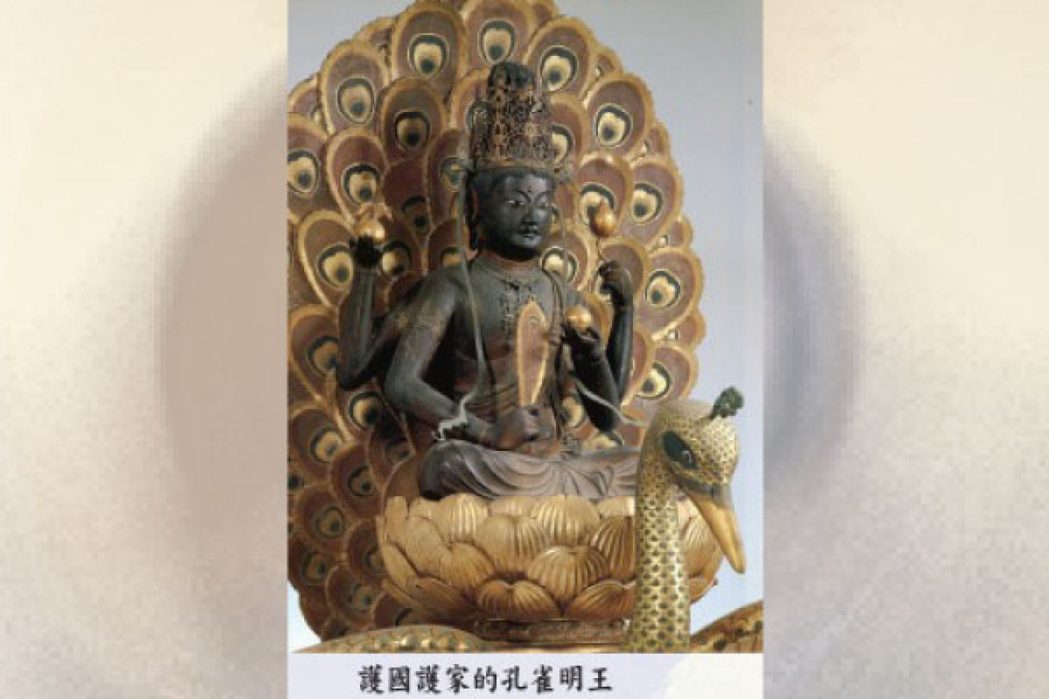 在神壇上擺放孔雀毛,除代表孔雀明王法,亦代表佛母佛眼及孔雀明王眼睛,具降魔伏妖,入定修行不為所動之含意。