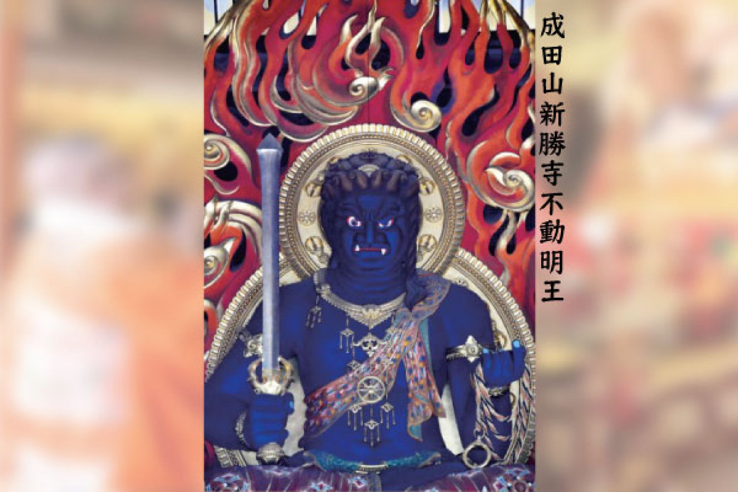 進入後,見到三層樓高的彩色不動明王,這是修明佛院火供壇不動明王的母佛。如此宏偉的不動明王像,唯成田山新勝寺獨有。不動明王殿彩色繽紛,代表修行之豐盛,將明天極樂世界帶到今天,即身成佛,不需等待三大阿僧祗劫方可成佛。