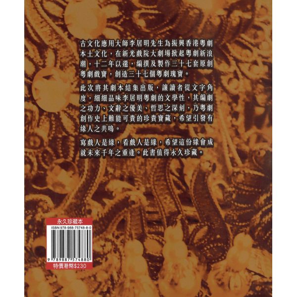 古文化應用大師李居明先生為振興香港粵劇本土文化,在新光戲院大劇場掀起粵劇新浪潮,十二年以還,編撰及製作三十七套原創粵劇戲寶,創造三十七個粵劇瑰寶。此次將其劇本結集出版,讓讀者從文字角度,細細品味李居明粵劇的文學性,其編劇之功力、文辭之優美、哲思之深刻,乃粵劇創作史上難能可貴的珍貴寶藏,希望引發有緣人之共鳴。此書值得永久珍藏。